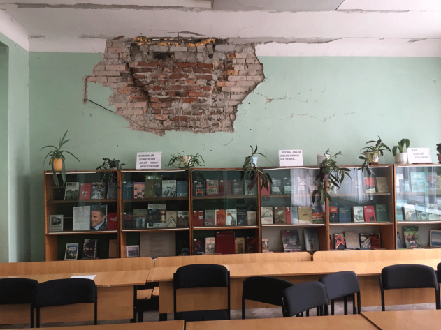 Библиотека, читальный зал. Пролом в стене – «прилетело».
