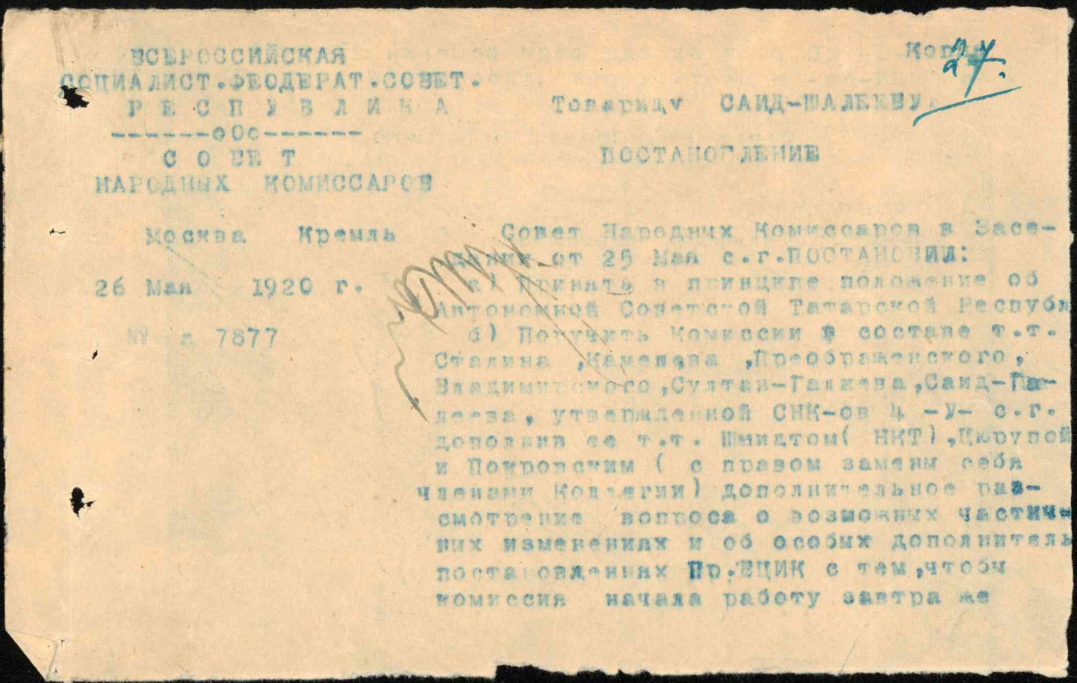 Как вроде бы обще известно, 27.05.1920 был издан Декрет ВЦИК и СНК РСФСР от «Об Автономной Татарской Социалистической Советской Республике». С этого момента и считается «день рождения» республики, празднование 100-летия которой намечено на 2020 год. Декрету предшествовало подписание Постановления аналогичного содержания. Декрета я не видел, только текст в Интернете, а, вот, Постановление - есть на сайте архива Республике Татарстан вот тут http://татархивы.рф/ru/content/постановление-вцик-и-с..