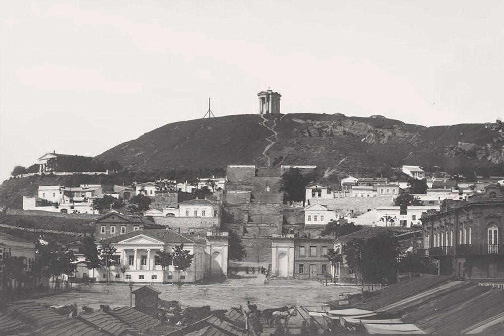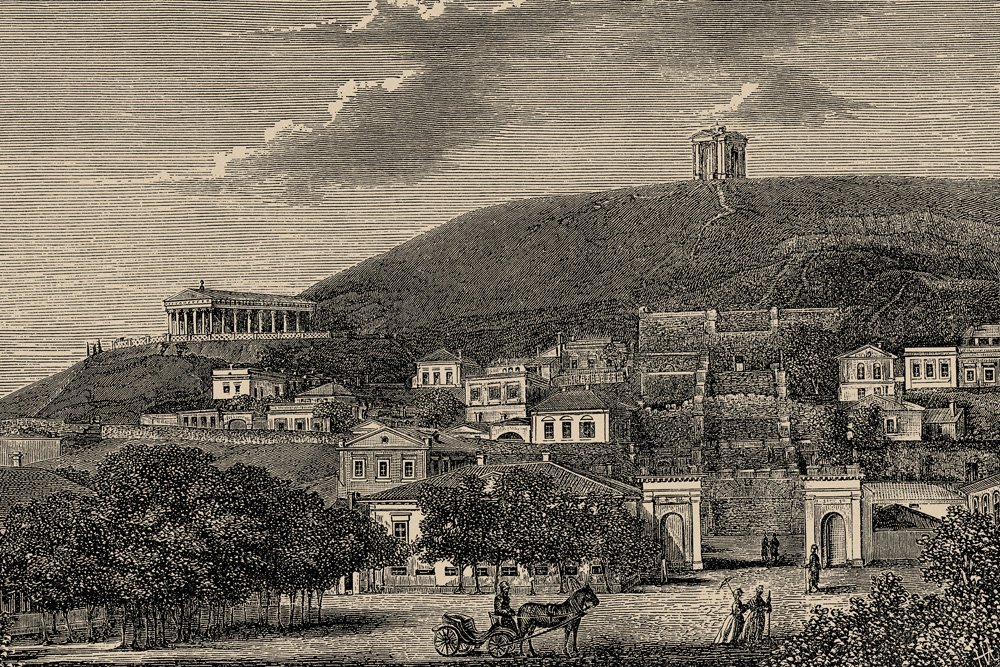 Гравюра. Вид с Предтеченской площади на комплекс Митридатской лестницы, 1870-е