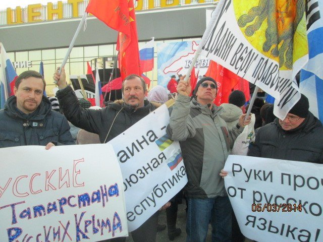 Меня тогда с товарищами внутрь ограждений не пустили полицейские. "Символика "не та": - заключили эксперты в погонах. Людей с "не той символикой" оказалось вне ограждений несколько сотен, включая активистов Национально-освободительного движения - НОД - с флагами, плакатами в поддержку Крыма и Новороссии. Впрочем, никаких замечаний от сотрудников полиции и организаторов не поступало, и все участвовали, как считали, в общем мероприятии. Я стоял с плакатом "Поддержал Крым - поддержи Донбасс", держал прозрачный куб для сбора гуманитарной помощи "в поддержку Донбасса" и флаг ДНР, рядом бил в Барабан друг художника Константина Васильева известный казанский русский активист Анатолий Гаврилович Кузнецов. Люди подходили, интересовались ходом сбора гуманитарной помощи, клали деньги в куб.