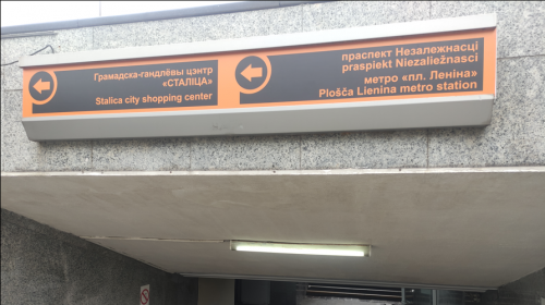 На уличных указателях, как и на вокзале, и в метро, нет ни одного указателя на русском языке. Часто встречается выдуманная белорусизаторами и мало кому понятная «латиница». Её много где наносят вместе с надписями на английским (транслитерацией с «мовы») и китайскими иероглифами.