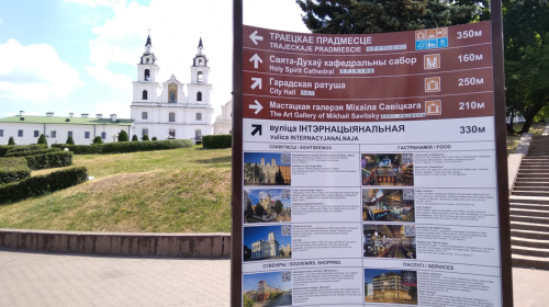 По пути к этой гостинице обыватель увидит городскую топонимику исключительно на «мове». Русский язык встречается только в коммерческой рекламе, почти все уличные указатели в Минске на русском языке уничтожены. Полностью заменены дорожные указатели – на них уже второй десяток лет только надписи на «мове» и иногда – на английском.