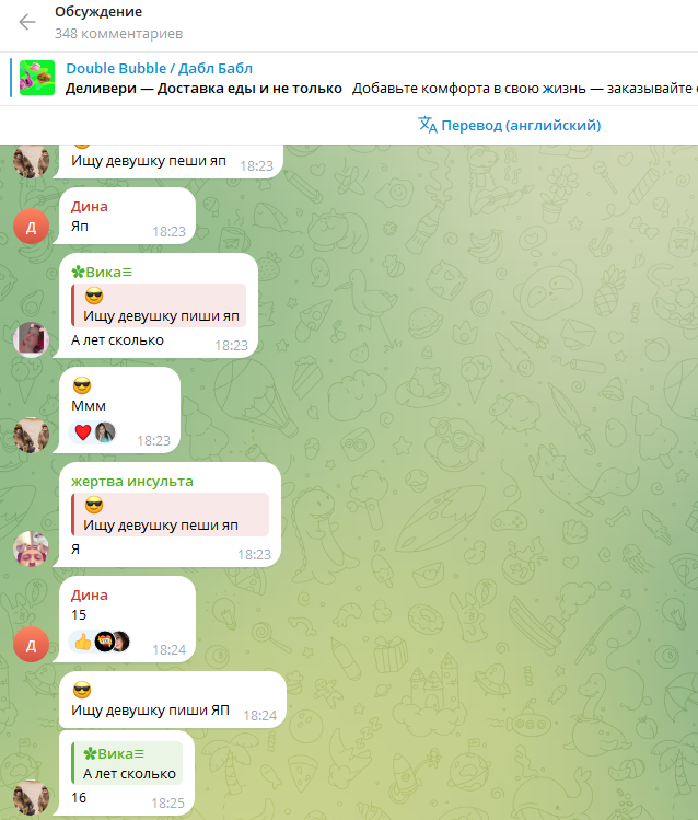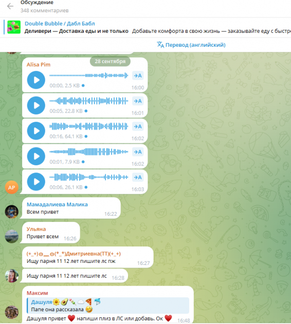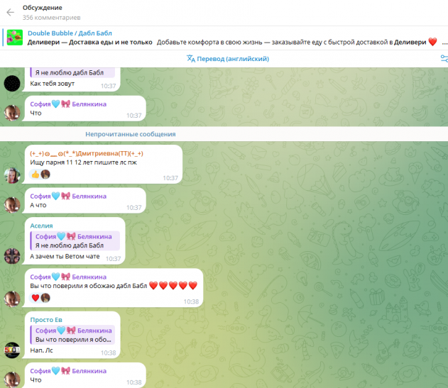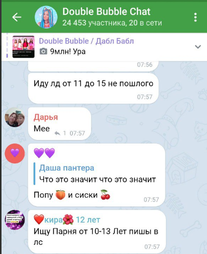 У парочки 35-летних "детских блогеров" есть Телеграмм канал. Под некоторыми постами сотни комментариев малолетних девочек, где они не только восхваляют Анну Dubble Bubble, которая стала для них кумиром, но и активно ищут отношения с более взрослыми мужчинами! Многие сообщения носят сексуальный характер. Некоторые дети пытаются найти себе парня или девушку в комментариях под постами. Что еще страшнее, там же сидят сомнительные личности с вымышленных аккаунтов и ведут переписку с детьми. Эти «фейковые» аккаунты ставят «лайки» детским комментариям про поиск «отношений», в описании аккаунта предусмотрительно оставлена ссылка на канал с рекламой сомнительных знакомств! Видимо, чтобы избежать ответственности, модераторы удаляют практически все детские комментарии, но очень неспешно. Фактически, сотни детей видят их и общаются на «взрослые темы» с сомнительными личностями на протяжении часов.