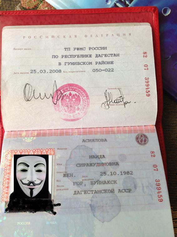 «Фото паспорта, приведенное в нашей статье, сделано 3 августа 2013 года на телефон, на iPhone 5, если быть точнее. Эта идиотка Асиялова в угаре ваххабизма в паспорт вклеила укутанную распечатку. На контроле паспортного режима она с ним попалилась и там было сделано это фото паспорта. С тех пор оно у нас и было. Хранилось, как часть информации о женщине из группы риска».